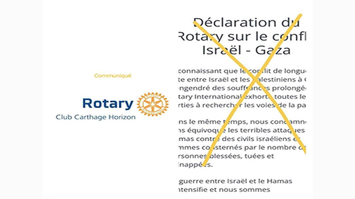 وعليه، وباعتبار أن هذا الموقف لا يمثل روتاري قرطاج الافق، وترفضه من حيث المبدإ و تستنكره، فإن روتاري قرطاج الافق يعلن انسحابه من هذه المنظمة التي كان ينتمي إليها بهدف المساهمة في العمل الاجتماعي لتحقيق العدالة بين التونسيين، ولتقديم المساعدة للمحتاجين في بلادنا. إن مبادئ روتاري قرطاج الافق لا تتجزأ، وموقفه واضح من القضية الفلسطينية العدالة التي  ستكلل بنصر قريب ان شاء الله. عن نادي روتاري قرطاج الافق، الرئيسة، ايمان بحرون بن مراد.