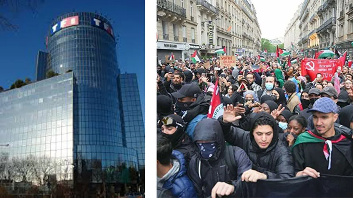 تجمع عدة مئات أشخاص مساء الخميس، 30 ماي 2024، أمام مقر قناة TF1 في باريس، قبل البث المباشر مع رئيس الوزراء الإسرائيلي بنيامين نتنياهو الذي بثته كذلك قناة LCI الإخبارية.