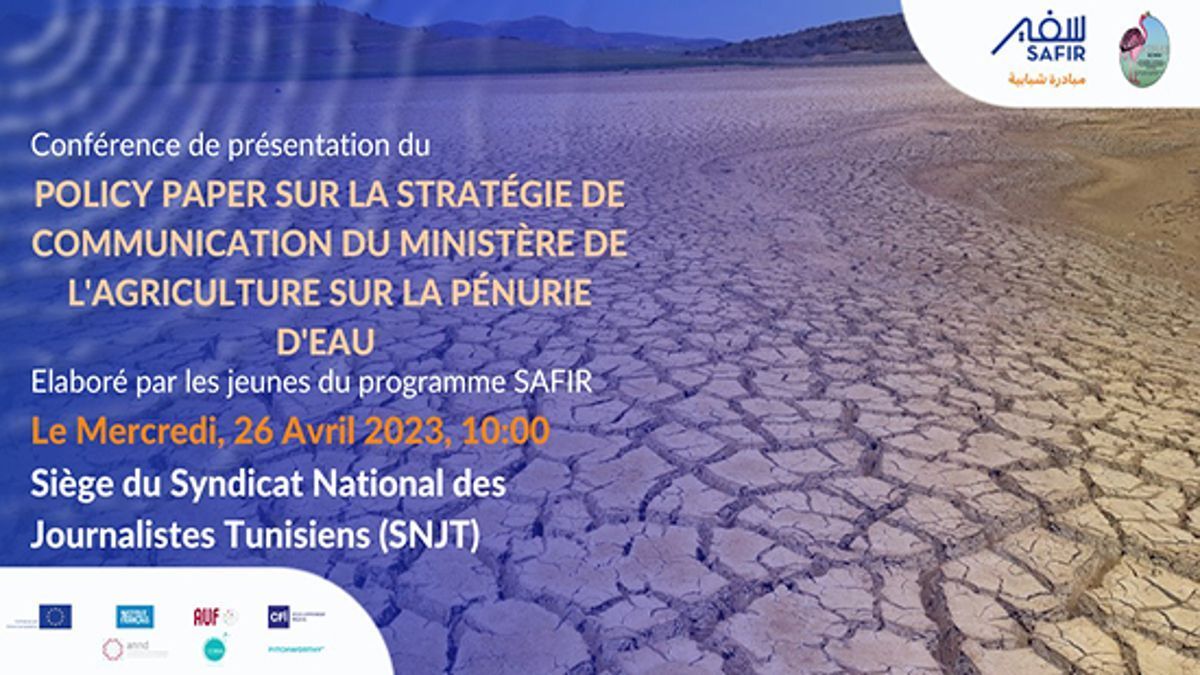 وفي مواجهة الوضع المقلق لنقص المياه في تونس ، يسعد شباب برنامج SAFIR تعبئة الحضور يوم 26 أفريل 2023 في مقر النقابة الوطنية للصحفيين التونسيين (SNJT) على الساعة 10:00. ويهدف مشروع سفير التنمية المستدامة وهو برنامج موجه لصالح الشباب في تسعة بلدان من الشرق الأوسط وشمال افريقيا. ويطمح الى خلق بيئة يشارك فيها الشباب في المواطنة عن طريق تزوديهم بوسائل العمل وعلى تحقيق أهداف التنمية المستدامة والمشاركة في التغيير وصنع القرار بطريقة مؤثرة.