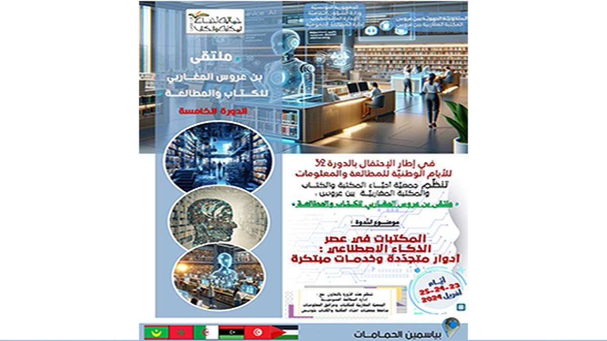 تزامنا مع الإحتفال باليوم العالمي للكتاب، تنظّم جمعيّــة أحبّـــــاء المكتبة والكتــــاب، الدورة الخامسة لملتقــى بن عروس المغاربي للكتاب والمطالعة تحت عنوان المكتبات في عصر الذكــاء الاصطناعي: أدوار متجدّدة وخدمــات مبتكرة.