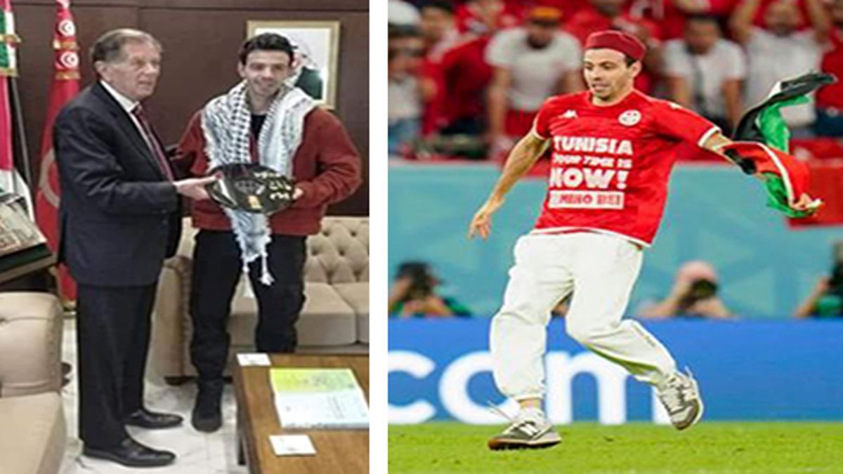 كرم السفير الفلسطيني بتونس الشاب التونسي الذي نزل على عشب مباراة المونديال حاملا راية فلسطين.