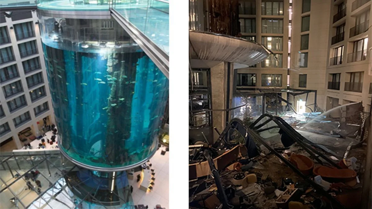 تحطم أنبوب يبلغ ارتفاعه 25 مترًا ممتلئا بالمياه وتسبح داخله 1500 سمكة وهو معروف في برلين تحت اسم AquaDom