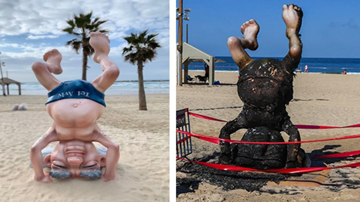 ولقد تعرض التمثال لأضرار بليغة جراء إحتراقه في الصباح الباكر في شاطئ فريشمان بتل أبيب. وهو عمل تخريبي وقع مع الساعة 5:25 من صباح يوم السبت الفارط. وتمثل التحفة المنحوتة، دافيد بن غوريون، في صورة شهيرة إلتقطها له المصور بول غولدمان، سنة 1957، وتظهر رئيس الحكومة السابق واقفا على يديه على الرمال. وقالت الشرطة في وقت لاحق، تم القبض على رجل مشرد يبلغ من العمر 34 عاما لصلته بالتخريب ويعاني من مشاكل نفسية، كما ظهرت الصور التي إلتقطتها كاميرات المراقبة، فردا يقترب من التمثال صباحًا، إلا أنه الصعب تحديد الدافع وراء هذا الحرق المتعمّد.