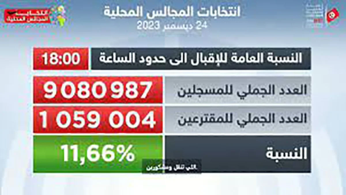 ورغم نسبة الإقبال المتواضعة، 11.66%، انتهى التصويت للمجالس المحلية التونسية في مرحلته الأولى يوم الأحد 24 ديسمبر 2023، وبلغ عدد المشاركين في الاقتراع مليون و59 ألف وأربعة من أصل يفوق 9 ملايين ناخب. وبحسب عضوة الهيئة المستقلة للانتخابات، نجلاء العبروقي، فإن هذا الأمر لن يعرقل تشكيل الغرفة البرلمانية واستكمال المؤسسات الدستورية، وفق دستور 2022، وهو عزوف عن المشاركة في الانتخابات جاء بعد ملل التونسيين من السياسة بسبب الأجواء السابقة في البرلمان.