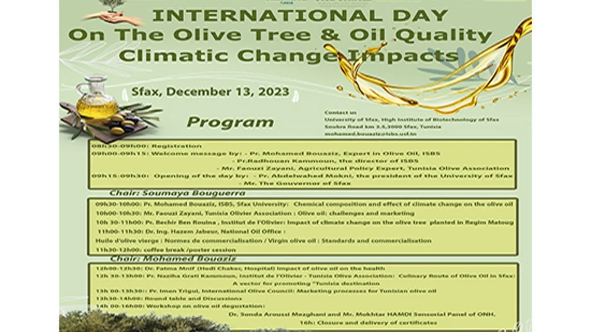 ينظم المعهد العالي للبيوتكنولوجيا بصفاقس ملتقى علمي دولي حول شجرة الزيتون وجودة الزيت وتأثيرات التغير المناخي وذلك يوم الأربعاء 13 ديسمبر 2023.