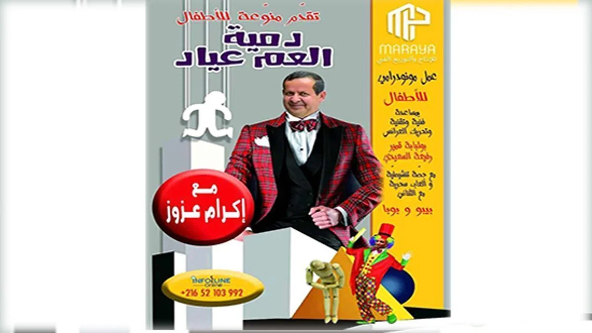 يواصل الفنان المبدع إكرام عزوز جولته الفنية بعديد جهات الجمهورية لتقديم المنوعة الفرجوية دمية العم عياد والتي تحتوي على فقرات مختلفة ومتنوعة.
