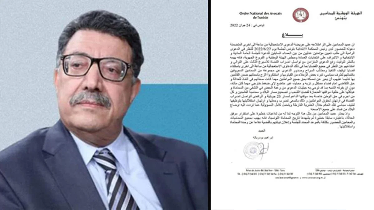 نشرت الهيئة الوطنية للمحامين بلاغا تعلم فيه الرأي العام أنه تم استدعاء عميد المحامين ابراهيم بودربالة لدى رئيس المحكمة الابتدائية بتونس لجلسة يوم الاثنين 27 جوان من الشهر الجاري