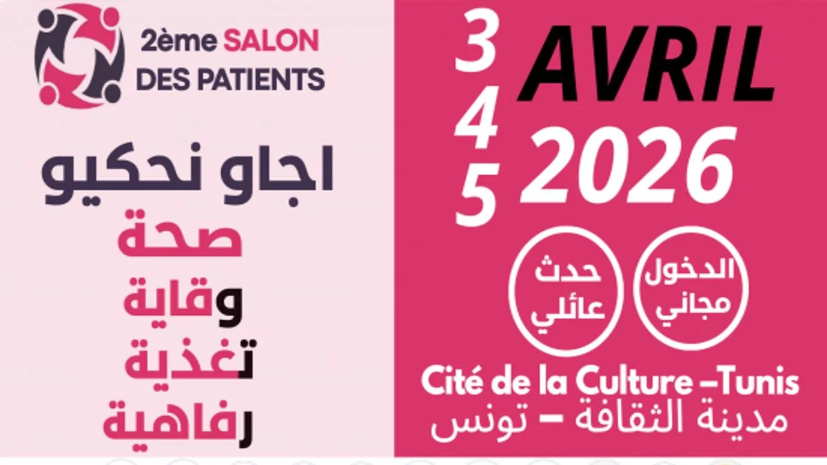 تنطلق فعاليات الدورة الثانية من صالون المرضى يوم الجمعة 03 أفريل 2026 على الساعة العاشرة صباحًا بقاعة المبدعين الشبان بمدينة الثقافة بتونس العاصمة، وذلك تحت شعار: ايجاو نحكيو صحة وقاية تغذية رفاهية.
