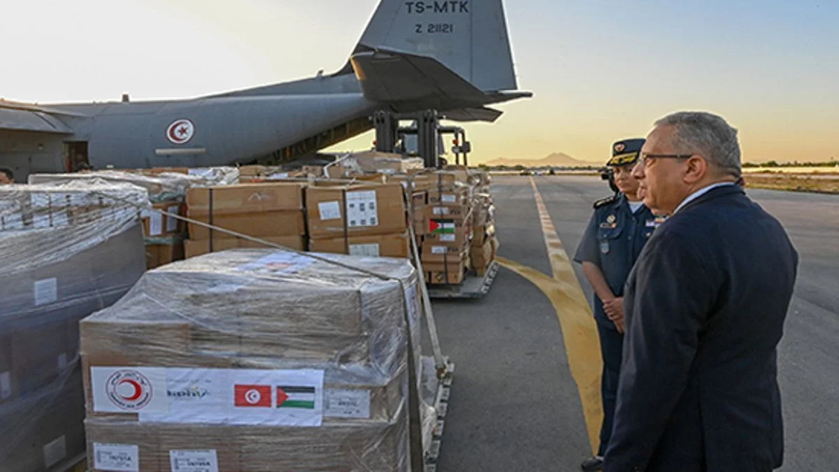 أقلعت صباح يوم الأحد، 15 أكتوبر 2023، من مطار العوينة طائرة عسكرية تونسية محملة بمساعدات إنسانية موجهة للشعب الفلسطيني في غزة.