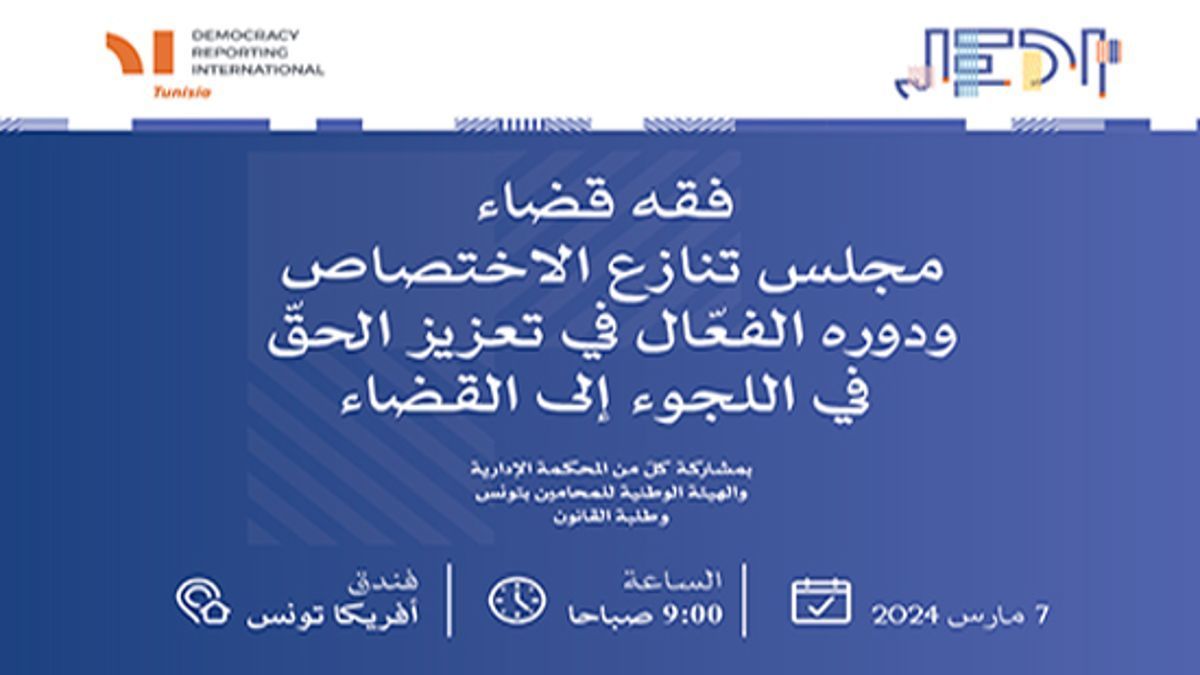 تنظم المنظمة الدولية للتقرير عن الديمقراطية ملتقى تحت عنوان فقه قضاء مجلس تنازع الاختصاص ودوره الفعّال في تعزيز الحقّ في اللجوء إلى القضاء يشارك فيه كلّ من رئيس المحكمة الإدارية عبد السلام مهدي قريصيعة وعميد الهيئة الوطنية للمحامين بتونس حاتم مزيو.
