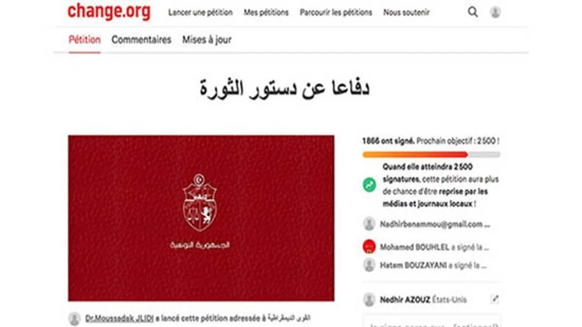 فتح عدد من نشطاء المجتمع المدني التونسي على موقع change.org عريضة تتمسك بدستور 2014 وتندد بالقرارت الاستثنائية التي فرضها الرئيس قيس سعيد منذ 25 جويلية 2021…